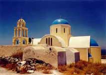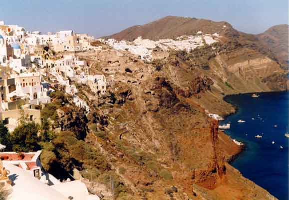 Architecture Along the cliff of Oia, houses have been delved into the porous volcanic rock (left over from a large volcanic explosion many years ago that sunk the center of the island). Parts of these houses are visible and the scenery that results from it is generally perceived as being typically Greek. The town is noted for its picturesque architecture, unique for its blend of relatively large (for the town's space) medieval Venetian houses (dubbed "kapetanea" gr: "καπετανέα" - as they belonged to the captains) with small incave village homes, called "yposkafa" (gr: "υπόσκαφα", caved-in) which were the housing form of the rest of the town's population. This is a reminiscent of the age of Venetian rule over the island. Other attributes of this era are the large Catholic population as well as the medieval fortifications to protect from pirates. To this day laws protect the natural and architectural beauty of the town from modern manifestations, such as public electrical wires. Tourism Oia remains one of the foremost tourist attractions of the Aegean Sea. The famous Oia sunset, considered by many as one of the most beautiful in the world, keeps tourists flocking down to the castle, waiting for the moment when the sun slips down on the calm sea of the caldera. Tourists are often told that the fishing docks at Oia are the oldest continually used docks in the world, supposedly being in service for 3000 years. While an interesting bit of tourist trivia, no evidence is supplied to validate the claim. In the evening hordes of people arrive simply to watch its sunset. Every available seat, wall, step or patch of ground is occupied and picnicking while watching the sunset is almost de rigueur. A common method for enjoying the sunset is to take one of the boat charters from the docks at Thira. After visiting the volcano in the middle of the caldera, the boat will visit the opposite island for a time before heading out a mile or so from the island. At sunset the boat will sail in a figure 8 until the sun goes below the horizon, providing a long view of the setting sun and ample photographic opportunities. Naval Maritime Museum A 19th century mansion has been restored and converted into a museum that houses the Maritime History of Thira. Rare figureheads, Seamens' Chests, old maritime equipment, carrening drawings and patterns, models of old and new Thiran ships, acquarelles featuring old sailing vessels as well as rare photographs and a library, all register year by year the contribution of the Thirans to the glorious history of the Hellenic Navy. Oia reached the peak of prosperity in the late 19th & early 20th century. Its economic prosperity was based on its merchant fleet which plied trade in the Eastern Mediterranean, especially from Alexandria to Russia. Hence the two-story captains houses built on the highest part of the village which are a reminder of the village's former affluence. Oia in books and films Louise Candlish's 2007 novel Since I Don't Have You is set in Oia and London.[2] Oia was the center of most of the story in the 1982 movie Summer Lovers. In 2004, it was used for the location of a few scenes in the movie The Sisterhood of the Traveling Pants and again for The Sisterhood of the Traveling Pants 2. Division of the community