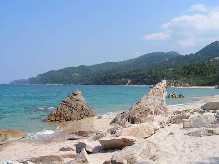 Gulfs that surround the peninsula are the Singitic Gulf to the west and the Toronean Gulf to the east. The mountain Itamos or Dragountelis is in the center of the peninsula. Amongst the many places in Sithonia is the ancient city, the castle and the church of Agios Athanasios in Toroni, the windmills in Sikia and the 16th century church in Nikiti. Porto koufo, is the largest and safest natural harbor in Greece, which is mentioned by Thucydides as "hollow harbor" it appears to be the fishing spot in the area. South, from the harbors exit you will find Kartalia, the most southern part of Sithonia, a very impressive area which puts its visitors under a spell with its rocky secluded beaches. Known for their natural beauty are the beaches Azapiko, Tristinika, Korakas, Marathias, Kalamitsi, Kriaritsi. All the villages cover the peninsula mainly in the central and the southern portions. The landscape are covered with forests, grasslands, and mountains