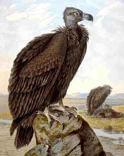 The Eurasian Black Vulture (Aegypius monachus) is also known as the Monk Vulture, the Cinereous Vulture, or just the Black Vulture. It is the only species in the genus Aegypius. It is a very large bird of prey in the family Accipitridae which also includes many other diurnal raptors such as kites, buzzards and harriers. This bird is an Old World vulture, and is not related to the New World vultures which are in a separate family Cathartidae. It is therefore also unrelated to the American Black Vulture despite the similar name and coloration. It breeds across southern Europe and Asia from Spain to Japan, but is endangered throughout its European range. It is resident except in those parts of its range where hard winters cause limited movement.