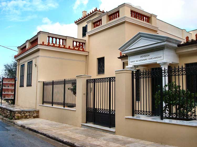 Exterior of the Museum of Pavlos and Alexandra Kanellopoulou The items of the collection include clay and stone vases and figurines, busts, jewellery, weapons, coins and inscriptionThe Museum of Pavlos and Alexandra Kanellopoulou is a museum of antiquities in Athens, Greece. Founded in 1976, it comprises the private collection of Paul and Alexandra Kanellopoulos which was donated to the Greek state. It is housed in the neoclassical mansion of the Michalea family, situated on the north slope of the Acropolis and built in 1864. The mansion was purchased by the Greek state in the 1960's-70's and was restored to permanently house the collection. The items of the collection include clay and stone vases and figurines, busts, jewellery, weapons, coins and inscriptions, ranging from 3.000-1.200 B.C. to the 18th and 19th centuries A.D.s, ranging from 3.000-1.200 B.C. to the 18th and 19th centuries A.D.