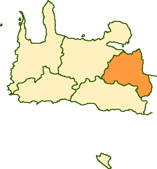 Apokoronas is a region of north-west Crete, Greece, in Chania prefecture, to the east of Chania city. The Apokoronas extends from the foothills of the White Mountains north to the coast, in a wide plain with rolling hills. To the east, Cape Drapanon rises above the plain and extends out into the Sea of Crete. The area is very green and fertile, unusual for rocky Crete. The Kiliaris river, known in antiguity as 'Pyknos', runs through the region. Robert Pashley suggested that the name 'Apokoronas' came from the ancient city of Ippokoronas or Ippokoronion, also cited by Strabo. This city may have been located near modern Nippos, or on the site of the Venetian fortress, Castel Apicorono, on an outcrop between Kalives and Almiridha. The major towns of Apokoronas are Vamos, Armeni and Vrisses, with police, municipal and utility offices as well as tavernas and large churches; Kalives, Almirida and Georgioupolis are the largest beach resorts. Tourism and agriculture are the major local industries, with much construction and quarrying to satisfy the demands of many foreigners eager to buy or rent properties in what used to be beautiful and traditional villages. Gavalohori and Megala Horafia are among the more popular villages for foreign buyers, with a large amount of often low-quality building taking place. Many residents or workers in Chania also have homes in the area. Apokoronas is a province of Greece with its capital at Vamos. The area is divided into several municipalities, within Chania prefecture, which hold most local authority. The municipalities of the Apokoronas are: