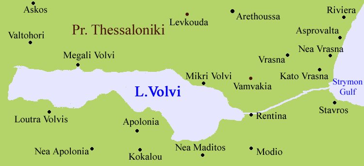 Bolbe (He Bolbe limne, Greek: Λίμνη Βόλβη, modern: Limni Volvi) was the name of a lake in Mygdonia, located at no great distance from the Aegean Sea. It is about 12 miles in length, and 6 or 8 miles in breadth. The lake emptied itself into the Strymon Gulf by means of a stream flowing through the pass once known as Aulon or Arethusa. The name of the stream is not mentioned by Thucydides in his description, but it is evidently the same as the Erechios (Romanized as Rechius) in Procopius (de Aedificiis, 4.4). Among the smaller streams flowing into the lake we find mention of the Ammites and the Olynthiakos. The perch (labrach) of the lake were particularly admired by the gastronomic poet Archestratus. There was also a town named Bolbos (Romanized as Bolbus) located near the lake. Today, there are a number of towns incorporating Vólvi in their name, situated along the lake. It is not known exactly if any of these modern towns correspond to the site of ancient Bolbos. The lake is now known as Lake Vólvi, in the prefecture of Thessaloniki, Greece. It is located east of Lake Koroneia or Lake Lagkada. The northern part of the lake is run by Via Egnatia and the old highway to the south. West is the narrows of Rentina, also known as the Macedonian Tempe since it looked like the valley of Tempe. Lake Volvi is the second largest lake in Greece. The area is 68 km² and the depth is 20 m. About a million years ago, Lake Volvi along with Lake Kerkinis and the entire Mygdonia was a huge lake.