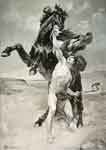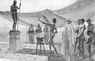 Silver Tetradrachm of Alexander the Great, a) head of Heracles b) Zeus Olympios, Archaeological Museum Dion There is an ancient Greek folktale still very popular in Greece today that there is a mermaid that constantly plows the wide seas and asks every captain whether Alexander the Great is still alive. If the captain dare answer "No, he died long time ago," the mermaid immediately raises a storm and sinks the ship. It was not said amiss by Antisthenes, when people told him that one Ismenias was an excellent piper. "It may be so," said he, "but he is but a wretched human being, otherwise he would not have been an excellent piper." And King Philip, to the same purpose, told his son Alexander, who once at a merry-meeting played a piece of music charmingly and skilfully, "Are you not ashamed, son, to play so well?" For it is enough for a king or prince to find leisure sometimes to hear others sing, and he does the muses quite honour enough when he pleases to be but present, while others engage in such exercises and trials of skill. Plutarch Pericles Once upon a time Philoneicus the Thessalian brought Bucephalus (bull-head), offering to sell him to Philip for thirteen talents, and they went down into the plain to try the horse, who appeared to be savage and altogether intractable, neither allowing any one to mount him, nor heeding the voice of any of Philip's attendants, but rearing up against all of them. Then Philip was vexed and ordered the horse to be led away, believing him to be altogether wild and unbroken; but Alexander, who was near by, said: "What a horse they are losing, because, for lack of skill and courage, they cannot manage him!" At first, then, Philip held his peace; but as Alexander many times let fall such words and showed great distress, he said: "Dost thou find fault with thine elders in the belief that thou knowest more than they do or art better able to manage a horse?" "This horse, at any rate," said Alexander, "I could manage better than others have." "And if thou shouldst not, what penalty wilt thou undergo for thy rashness?" "Indeed," said Alexander, "I will forfeit the price of the horse." There was laughter at this, and then an agreement between father and son as to the forfeiture, and at once Alexander ran to the horse, took hold of his bridle-rein, and turned him towards the sun; for he had noticed, as it would seem, that the horse was greatly disturbed by the sight of his own shadow falling in front of him and dancing about. And after he had calmed the horse a little in this way, and had stroked him with his hand, when he saw that he was full of spirit and courage, he quietly cast aside his mantle and with a light spring safely bestrode him. Then, with a little pressure of the reins on the bit, and without striking him or tearing his mouth, he held him in hand; but when he saw that the horse was rid of the fear that had beset him, and was impatient for the course, he gave him his head, and at last urged him on with sterner tone and thrust of foot. Philip and his company were speechless with anxiety at first; but when Alexander made the turn in proper fashion and came back to them proud and exultant, all the rest broke into loud cried, but his father, as we are told, actually shed tears of joy, and when Alexander had dismounted, kissed him, saying: "My son, seek thee out a kingdom equal to thyself; Macedonia has not room for thee." Plutarch, The Parallel Lives , The Life of Alexander “Alexander was said to have paid seventy-eight thousand denarii for his horse Bucephalas (or Bucephalus) , who, when equipped for battle, would allow no other rider. Once, grievously wounded and dying from a loss of blood, the animal safely removed Alexander from the battle and then fell down dead. In his honor, a city was built and named Bucephalon (V.3).” Aulus Gellius, Attic Nights Encyclopedia Romana (Bucephalus died in the year 326 BC) (Bucephalus was considered to be a descendant of the Mares of Diomedes) |