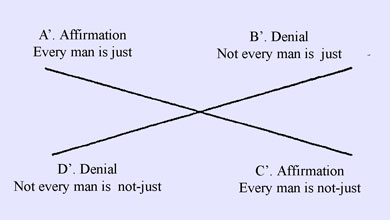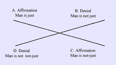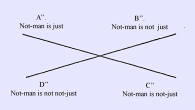 Yet here it is not possible, in the same way as in the former case, that the propositions joined in the table by a diagonal line should both be true; though under certain circumstances this is the case. We have thus set out two pairs of opposite propositions; there are moreover two other pairs, if a term be conjoined with ‘not-man’, the latter forming a kind of subject. Thus: