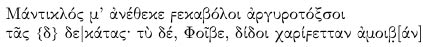 "Mantiklos offers me as a tithe to Apollo of the silver bow; do you, Phoibos, give some pleasing favor in return." Apollo the farshooter with his silver bow, his preferred weapon. Mantiklos hopes that by giving this gift Apollo will sometime remember and give to Mantiklos some gift in return. ...asking for a "pleasing return (chari Fettanamoib[an])," the figurine signals its participation in the bonds of charis and chreos that join parties to a gift exchange Deborah Tarn Steiner Images in Mind: Statues in Archaic and Classical Greek Literature and Thought Mary Depew, Reading Greek Prayers, Classical Antiquity, 16, 1997, p. 229 A similar case (and there are many more ) is the inscription of an offer to Athena on the Acropolis by Telesinos who "dedicated this, may you take delight and allow him to dedicate another", which means preserve his life so that he can later offer another sculpture.