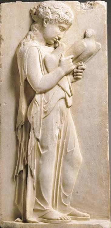 Relief (30 cm height Grave Stele) around 450 BC showing a young girl with doves wearing a Peplos. There are similar images of young girls with doves. This piece of Art was found in 1775 on the Greek island of Paros, a Cycladic Island. Now at the Metropolitan Museum in New York, US