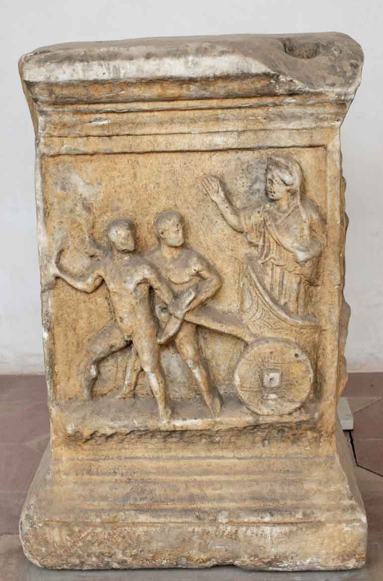 Altar with the myth of Kleobis and Biton. White marble, Roman artwork of the Imperial era. Found in Via della Giustiniana in Tor Vergata in Popolo.