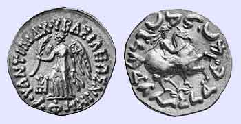 Obv: Goddess Nike with a victory plam in the right hand and a royal diadem in the left hand. Greek legend: BASILEOS NIKEFOROY ANTIMAXOY "Victorious King Antimachus". Rev: Antimachus riding a horse, helmetted. Kharoshthi legend: MAHARAJASA JAYADHARASA AMTIMAKHASA "Victorious King Antimachus". Antimachus II was a Greco-Bactrian king. He ruled on a vast territory from the Hindu-Kush to the Punjab around 170 BC. He was almost certainly identical with the eponymous son of Antimachus I, who is known from a unique preserved tax-receipt. He seems to have ruled areas to the east of his father, and is one of very few kings who did not strike portraits - this possibly reflects his status as junior co-regent. Like his father, Antimachus II was eliminated by the conquests of king Eucratides. According to Bopearachchi Antimachus II shares a mintmark with Plato, co-regent of Eucratides, and since the latters coins are dated 167-165 BC, this suggests that Antimachus II ended his reign around 167 BC.