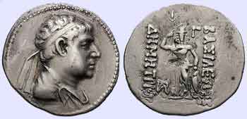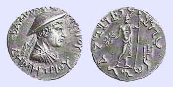 Silver coin of a king named Demetrius [Source] Demetrius II was probably a relative of the Bactrian king Demetrius and ruled the Indian dominions of the Greco-Bactrian empire for a short time. History records keep only one reference to this second Demetrius; Roman historian Justin names a "D, king of the Indians", who beleaguered the warlike Bactrian king Eucratides the Great with an army of 60 000 men against the latters garrisson of 300, but still - according to the probably exaggerated account - eventually was defeated. This episode is referred to as occurring at the end of the reign of Eucratides, hence dating the death of Demetrius II around 150 BC. Views are divided as for how to interpret the various coinage series bearing the name Demetrius. The upper coin shown was struck either by Demetrius I or II, whereas the nether has been said to belong to either of them or even a later king Demetrius III. This author notes the likeness of the nether portrait to kings Apollodotus I and Antimachus I and hence associates that coin with Demetrius II, who was a close successor of these kings and very likely belonged to the same dynasty, the house of Euthydemus I.