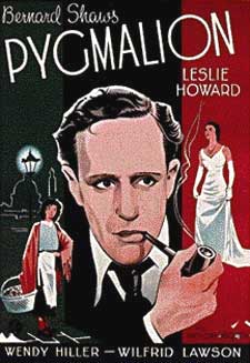 George Bernard Shaw, Pygmalion Overview A smug professor of linguistics, Henry Higgins (Leslie Howard), makes a bet with Colonel George Pickering (Scott Sunderland) that he can turn a simple Cockney flower girl, Eliza Doolittle (Wendy Hiller), into a refined lady within six months. Comedy with Shawvian social satire. The story lifts its title from the Greek myth about the sculptor who falls in love with his own statue of a lady, bringing sympathy from the gods who cause her to come to life. The script to this movie was later adapted into the theatrical musical "My Fair Lady" in 1956, which was again adapted into the 1964 Warner Brothers movie by the same name. Thus the interesting sojourn of the Pygmalion story goes from a Greek myth to an Irish play to a British movie to a Broadway play to a Hollywood movie. Links