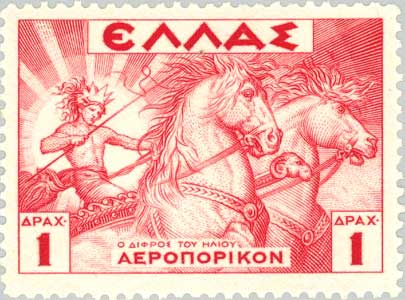 Helios (or Helius) with his Chariot, (Diphros) 10.11.1935 ; Design : M. Biskinis. Helios was the son of Hyperion and Theia. His son was Phaethon who once inexperienced used the Chariot of Helios that he could not control and was killed by a thunderbolt of Zeus.