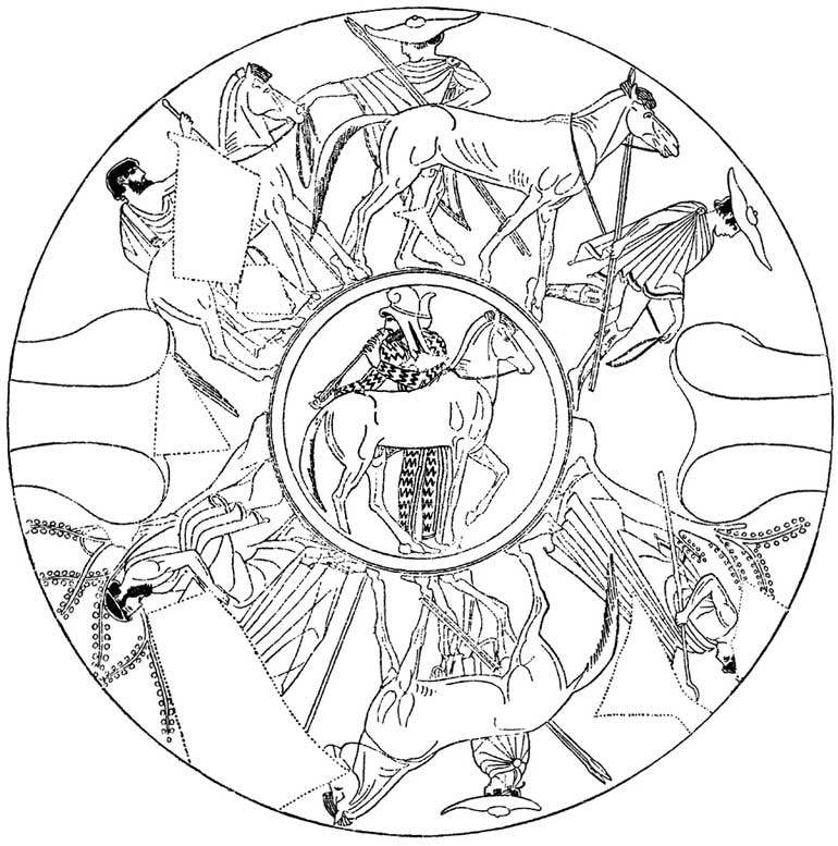 "Ippeis" with chlamys and Petasos , in the center a "barbarian" with horse