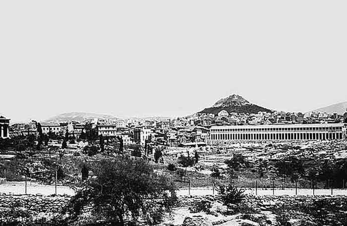 The Agora, Athens photo before 1946, Library of Congress The Ancient Agora of Athens is the most well-known agora, located in Athens, Greece. The agora in Athens had private housing, until it was reorganized by Pisistratus in the 6th century BC. Although he may have lived on the agora himself, he removed the other houses, closed wells, and made it the centre of Athenian government. He also built a drainage system, fountains, and a temple to the Olympian gods. Cimon later improved the agora by constructing new buildings and planting trees. In the 5th century BC there were temples constructed to Hephaestos, Zeus, and Apollo. The Areopagus and the assembly of all citizens met elsewhere in Athens, but some public meetings, such as those to discuss ostracism, were held in the agora. Beginning in the period of the radical democracy (after 509 BC), the Boule, or city council, the Prytaneis, or presidents of the council, and the Archons, or magistrates, all met in the agora. The law courts were located there, and any citizen who happened to be in the agora when a case was being heard, could be forced to serve as a juror; the Scythian archers, a kind of mercenary police force, often wandered the agora specifically looking for jurors. The agora in Athens again became a residential area during Roman and Byzantine times.