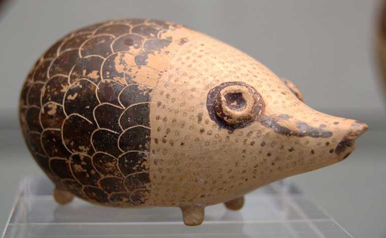 Hedgehog. Aryballos, opening in the left ear, metaphoric scales for the spine armor. C. 600 BC.