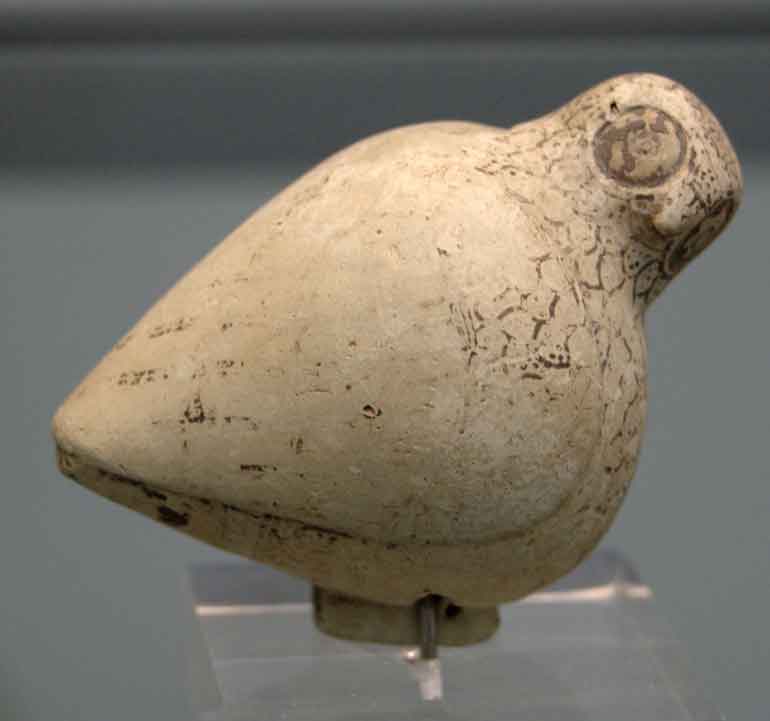 Owl-shaped protocorinthian aryballos, ca. 650 BC. Opening in the tail, hole in the basis to suspend by a lace