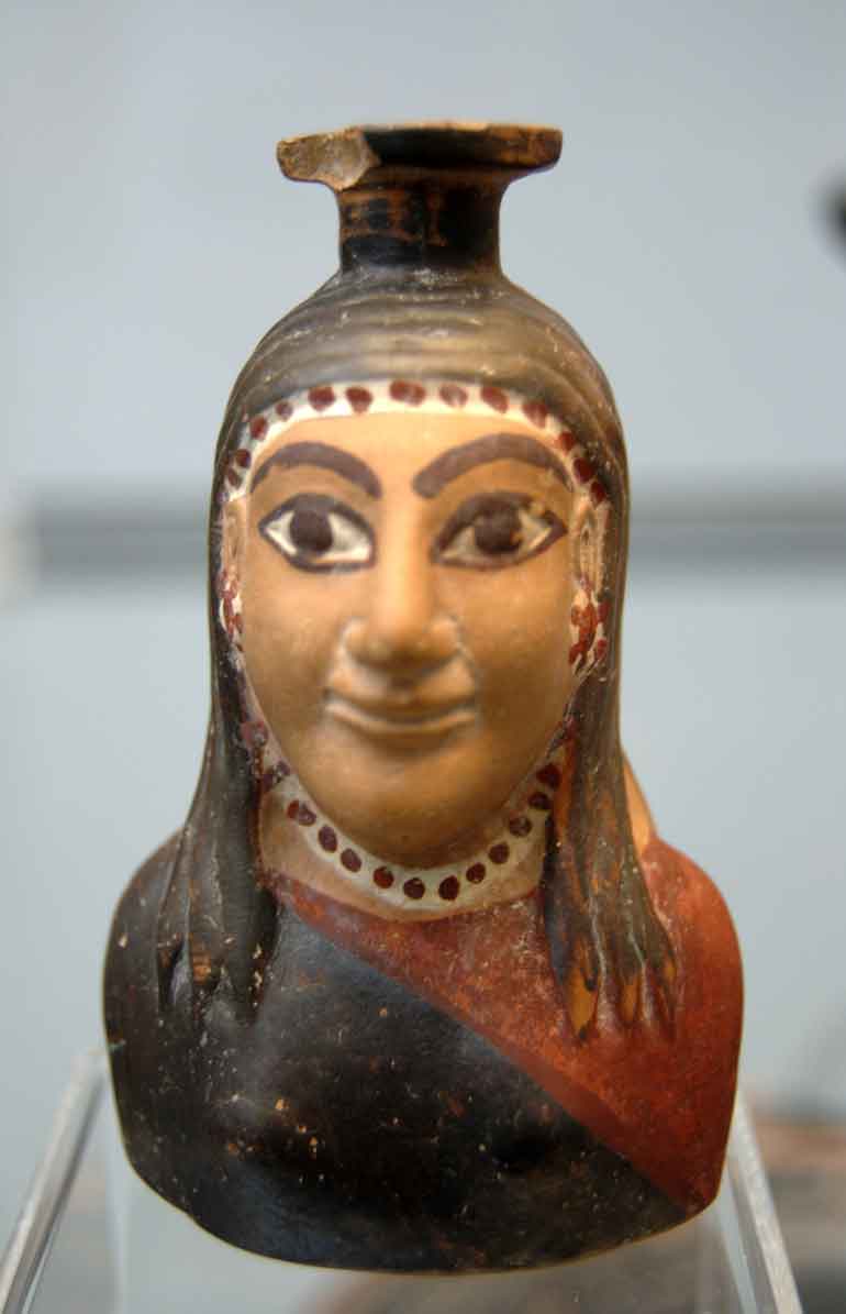 Bust of woman in chiton and coat in skew. Aryballos from East Ionia, c. 570 BC.