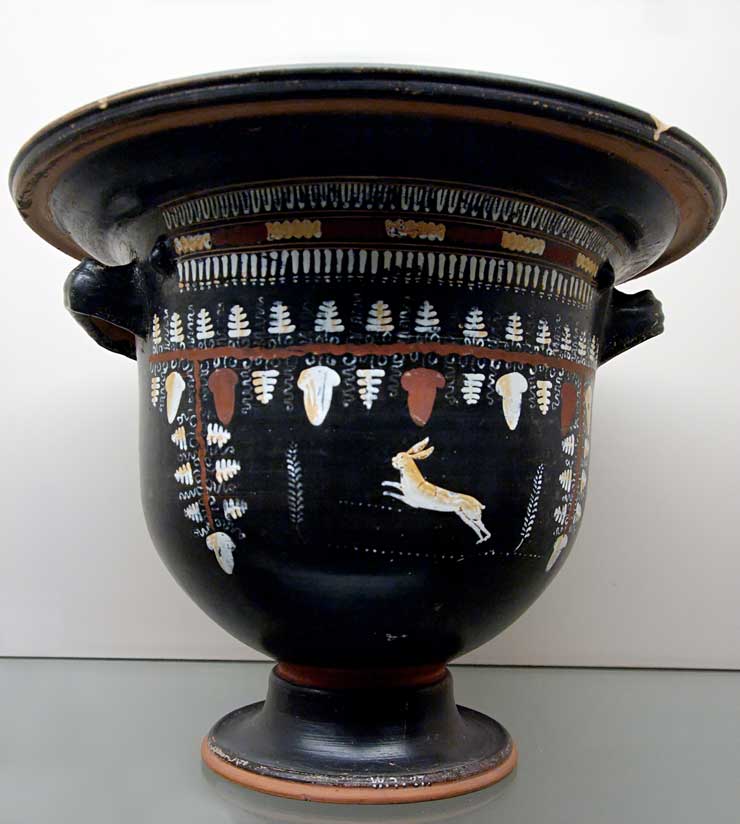 The British Museum, London, United Kingdom Artist/Maker Laurel Spray Group Hare and wines. Apulian bell-krater of the Gnathia style, ca. 330 BC. From Gnathia. Dimensions Unspecified Credit line Bequeathed by Sir William Temple Accession number GR 1856.12-26.27 (Cat. Vases F 547) Location Upper floor, room 73, The Greeks in Southern Italy Photographer/Source Jastrow (2006) All text is available under the terms of the GNU Free Documentation License