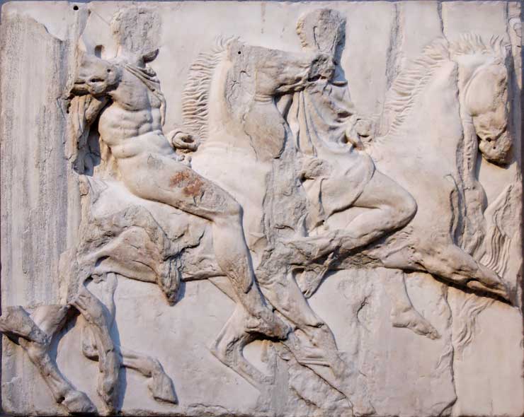 Artist/Maker Unknown Cavalcade. Block VII from the south frieze of the Parthenon, ca. 447– / 433 BC. Dimensions H. 1 m (3 ft. 3 ¼ in.), W. 1.22 m (4 ft. ), D. 60 cm (23 ½ in.) Credit line Former Elgin collection Accession number Unspecified Location Main floor, room 16, Greek & Rome Photographer/Source Jastrow (2006) All text is available under the terms of the GNU Free Documentation License