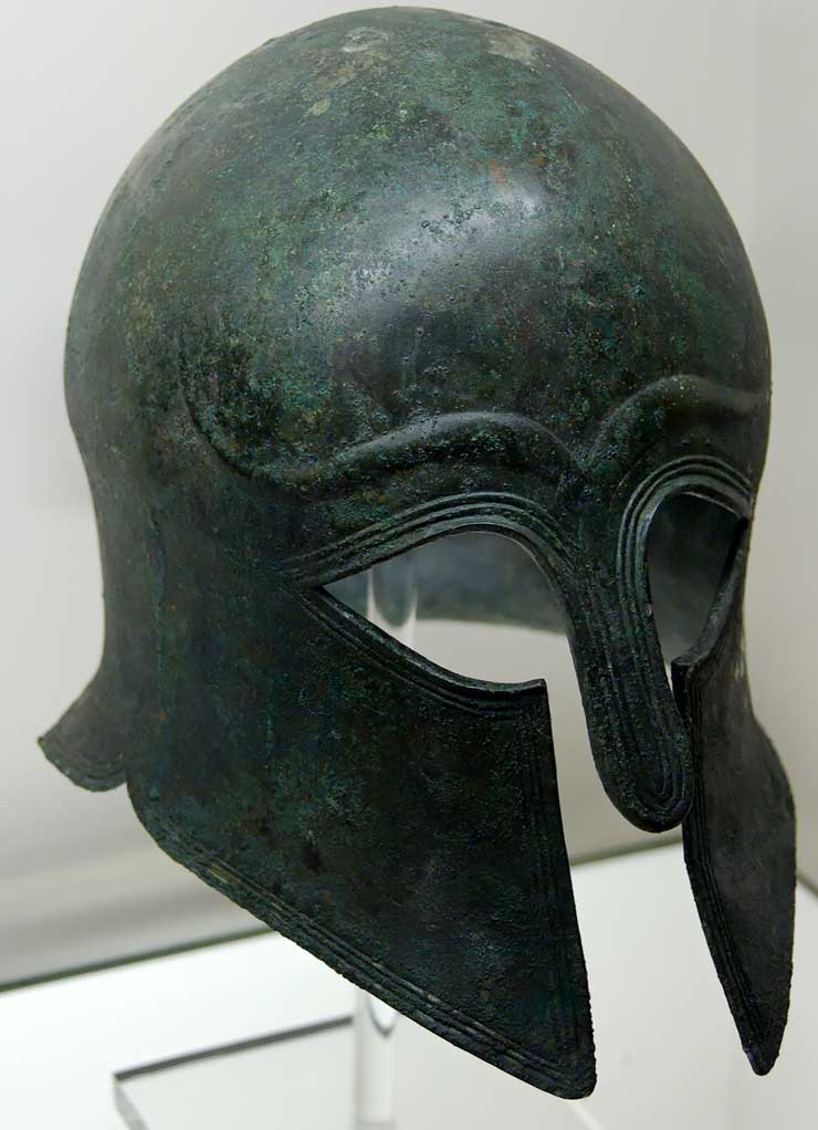 Corinthian helmet. Bronze, made in Apulia, ca. 510 BC.