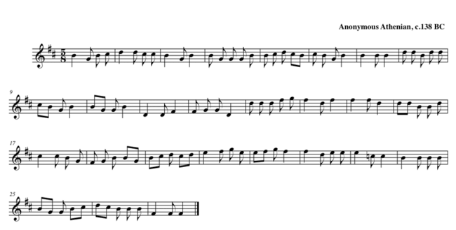 The first portion of the First Delphic Hymn, to be played on the kithara; the next section, not shown, is to be played on the aulos. Media:1st_delphic_hymn.mid The First Delphic Hymn is monophonic, consisting of a single melodic line, and it is in the cretic meter, which is quintuple, and it is in the Dorian mode not the Dorian mode as known in the present day, but rather as it originally was in Ancient Greece, roughly corresponding to the present day Phrygian mode (the names of the modes were mixed up by Anicius Manlius Severinus Boethius, who translated ancient Greek theoretical writings into Latin in the 6th century, and the confusion has remained). In addition to being the earliest surviving substantial fragment of ancient music, the First Delphic Hymn is also the longest; unfortunately it is not a complete composition (the Seikilos epitaph, dated anywhere between the 2nd century BC and the 1st century AD, is the earliest surviving complete piece of music). Exact performance practice is unknown, but Limenius is mentioned in a separate Delphic inscription as a master player of the kithara; likely he accompanied a singer or singers. While the kithara was used for the first section of the first hymn, the second section is to be performed on the aulos; it is also considerably chromatic. Whether the performer played the same music as the singer(s) in unison, or embellished the melodic line in a heterophonic texture, or played a drone, or improvised some form of counterpoint, are unknown; reconstructions of ancient Greek music are highly controversial, and the sources are often contradictory. Photograph of the original stone at Delphi containing the second of the two hymns to Apollo. The music notation is the line of occasional symbols above the main, uninterrupted line of Greek lettering References