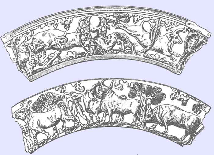 Drawing of the reliefs The greatest triumph of the goldsmith's art in the "Mycenaean" period does not come from Mycenae. ... gold cups .. were found in 1888 in a bee-hive tomb at Vaphio in Laconia. Each cup is double; that is to say, there is an outer cup, which has been hammered into shape from a single disc of gold and which is therefore without a joint, and an inner cup, similarly made, whose upper edge is bent over the outer cup so as to hold the two together. The horizontal parts of the handles are attached by rivets, while the intervening vertical cylinders are soldered. The designs in repousse work are evidently pendants to one another. The first represents a hunt of wild bulls. One bull, whose appearance indicates the highest pitch of fury, has dashed a would-be captor to earth and is now tossing another on his horns. A second bull, entangled in a stout net, writhes and bellows in the vain effort to escape. A third gallops at full speed from the scene of his comrade's captivity. The other design shows us four tame bulls. The first submits with evident impatience to his master. The next two stand quietly, with an almost comical effect of good nature and contentment. The fourth advances slowly, browsing. In each composition the ground is indicated, not only beneath the men and animals, but above them, wherever the design affords room. It is an example of the same naive perspective which seems to have been employed in the Tirynthian bull-fresco ..... Evidently we have here the work of an artist who drew his inspiration directly from nature. A History Of Greek Art, by F. B. Tarbell
