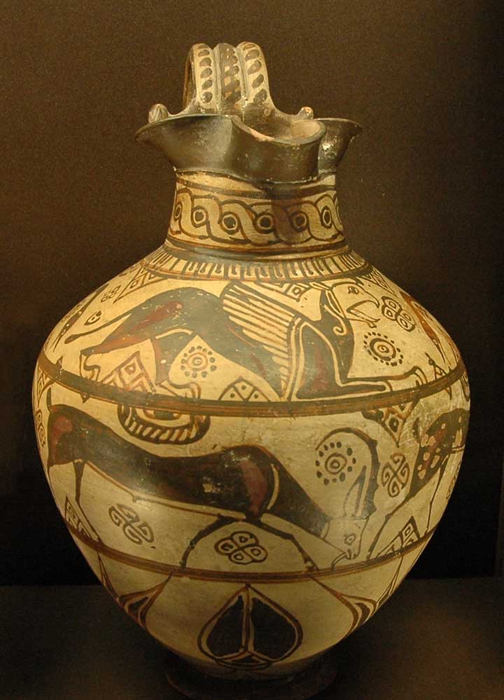 Oinoche of the wild-goat style. Camiros, Rhodes, ca. 625 BC–600 BC, height: 12.9".