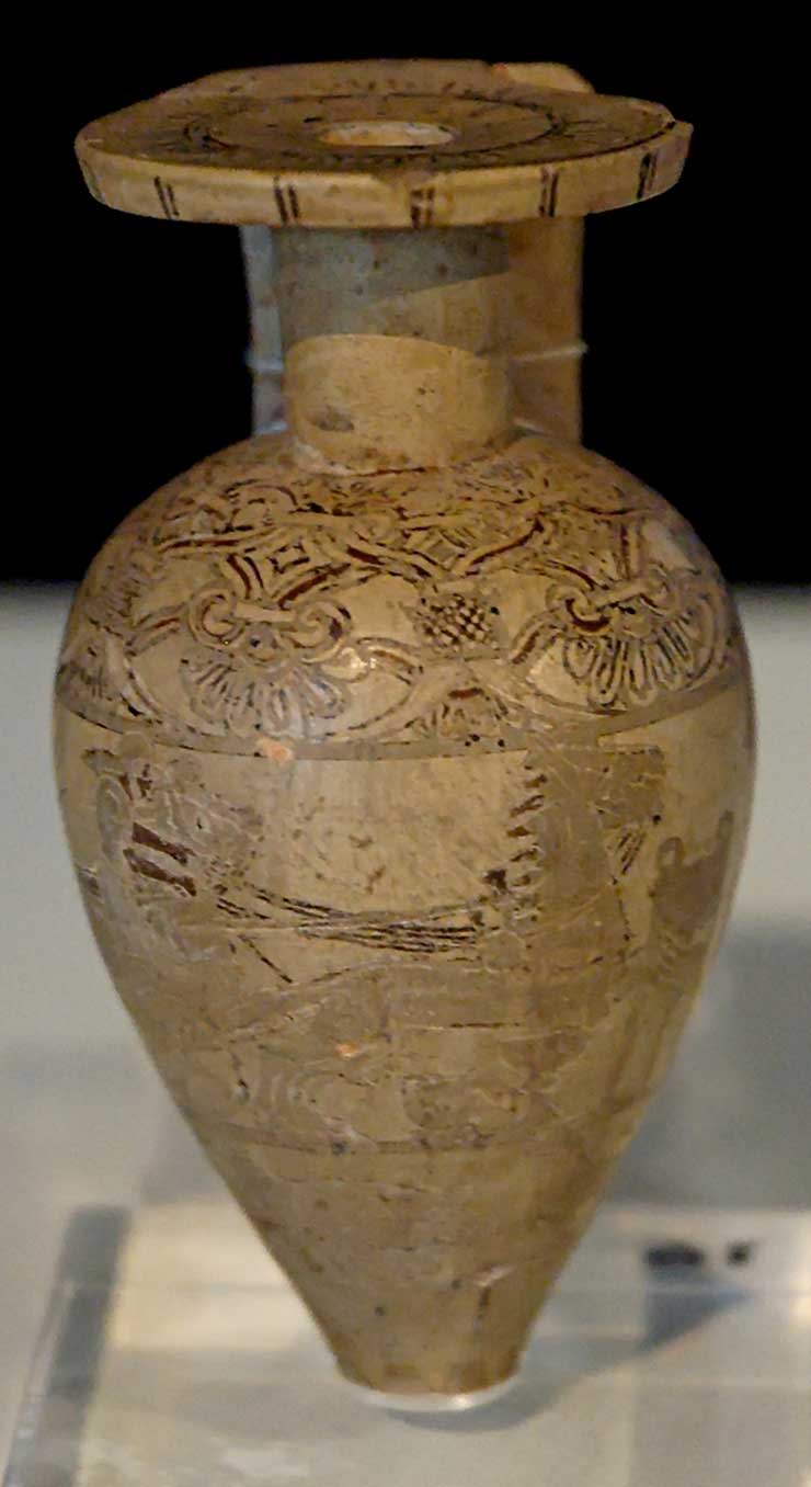 Belly: funeral games in honour of Patroclus; shoulder: animal frieze. Protocorinthian aryballos, 700–650 BC. From excavations around the Athenaion of Syracuse. Stored in the Museo Archaeologico Regionale “Paolo Orsi” in Syracuse.