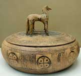 A pyxis is a type of Greek pottery used by women to hold cosmetics, trinkets or jewellery. It was usually a round box with a separate lid.