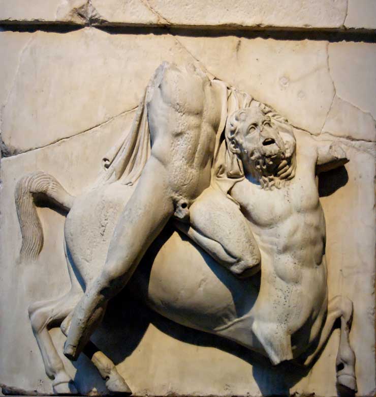 Lapith fighting a centaur. South Metope 2, Parthenon, ca. 447/433 BC.