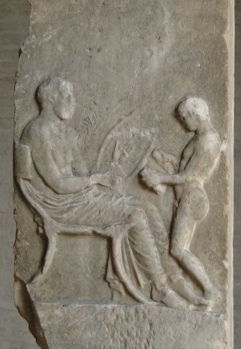 Stele: Funerary relief with a lyre player. A young boy, reading in a book role, recites a poem on the melody. Magna Graecia (South Italia), ca. 420 BC.
