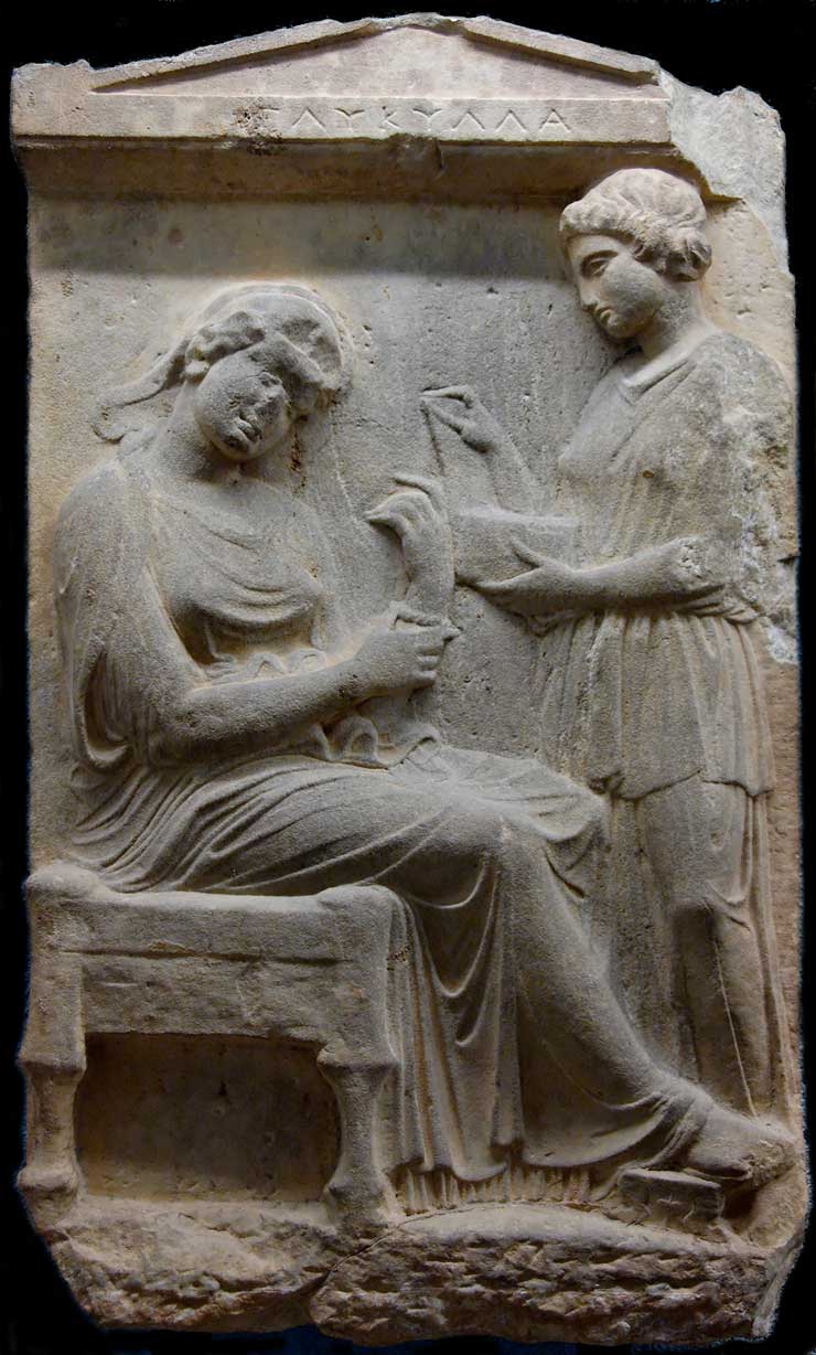 British Museum, London, United Kingdom Seated woman adjusting her bracelet while her young slave opens a casket. Marble funerary stele bearing the name of Glykylla, ca. 430/10 BC. Said to be from Thebes. Dimensions Unspecified Accession number GR 1893.6-27.1 (Cat. Sculpture 2231) Photographer/Source Main floor, room 19, Athens & the Acropolis, 430-400 BC All text is available under the terms of the GNU Free Documentation License