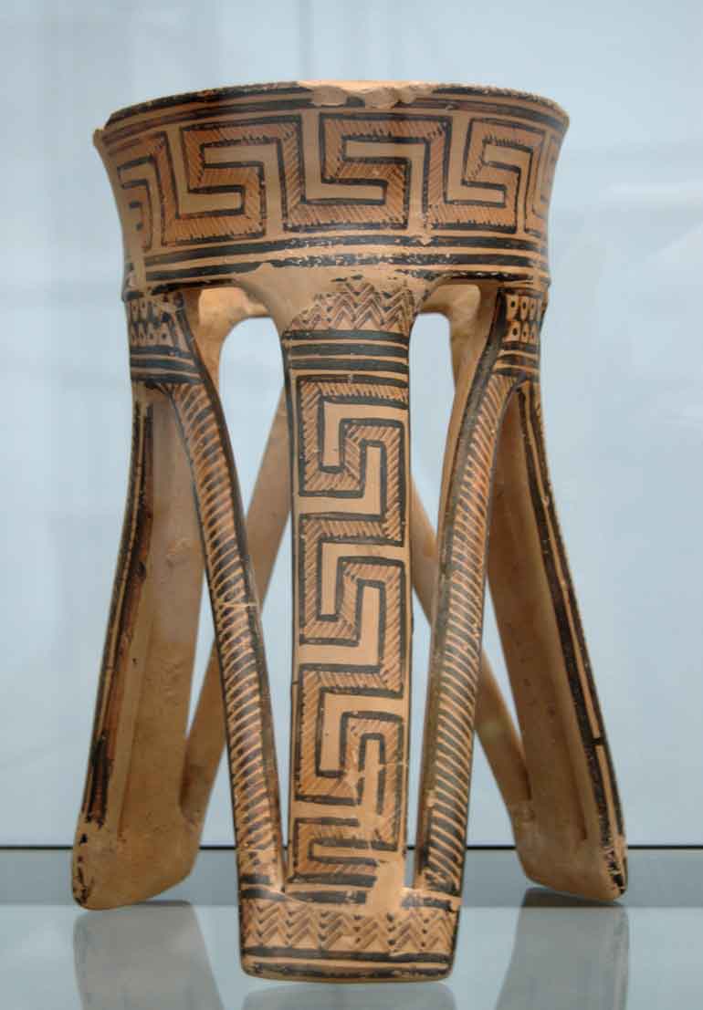 Pottery from a tomb. This clay support, probably for a wine jug, copies the precious bronze tripods of older times: an allusion to the “heroic” ages. Attica, early-Geometric style, ca. 850 BC.