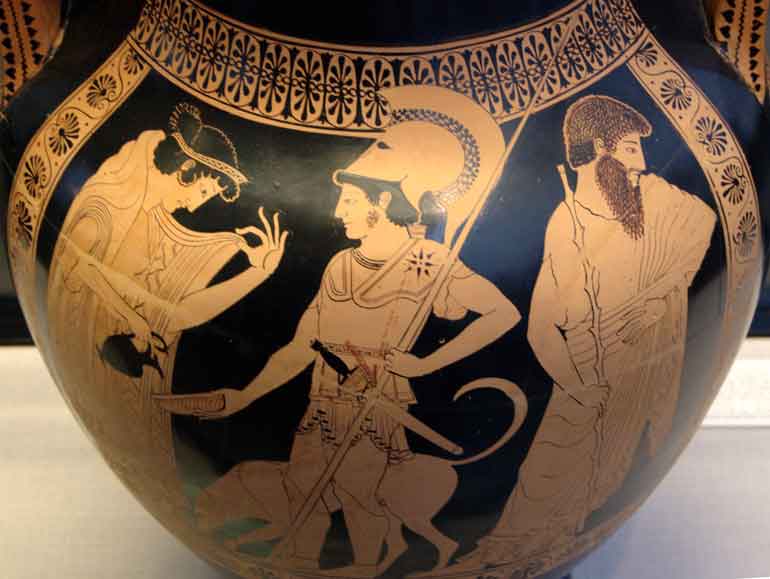English: Warrior departure. Side A of an Attic red-figure paunch amphora, 500–490 BC. From Vulci.