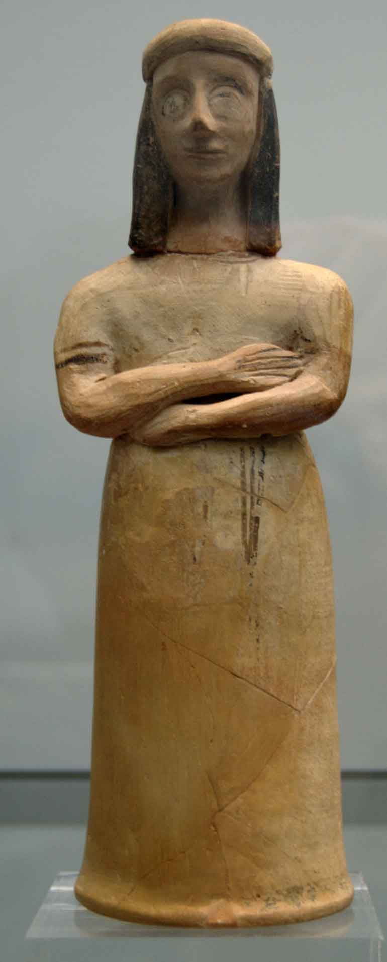 Woman with crown, probably a votive gift. Arms are crossed on the body as a sign of reverence and humility in front of the divinity. Crete, 630–610 BC.