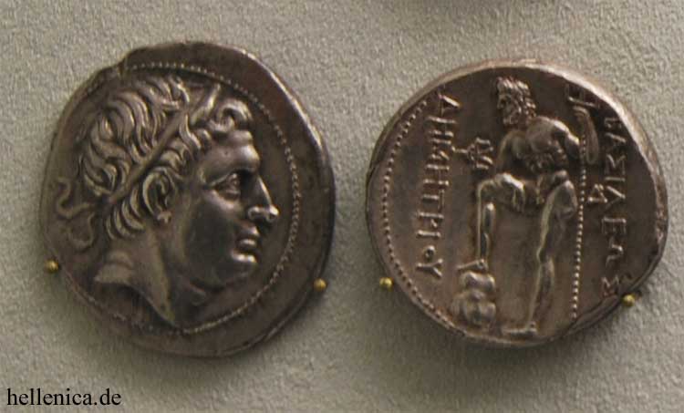 Coin of Demetrius I of Macedon. Greek inscription reads ΒΑΣΙΛΕΩΣ ΔΗΜΗΤΡΙΟΥ ([coin] of King Demetrius).
