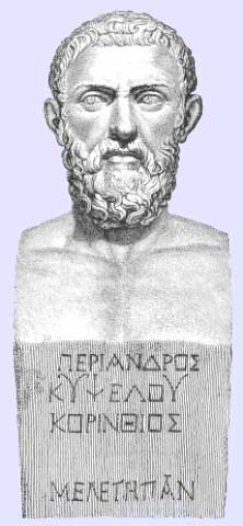 Periander (627 585) BC, son of Cypselus ruler of Corinth for more than 40 years. He was considered one of the Seven Sages of Greece. He restricted the number of slaves in Corinth trying to keep the citizens always busy in order to prevent them from conspiring against him. He supported greatly the arts, constructing various buildings and inviting poets and noted writers like Arion, Aesop and others. He tried to cut a naval passage through the Isthmos but he was prevented from the Delphic Oracle, who warned him not to proceed. The real reason, that he did not try though, was that such a giant project was above the technical capabilities of his time. Instead he constructed the Diolcos, a stone road that ships were carried on wheeled platforms from the eastern port of Cenchreae, in the Saronic gulf, to the western port of Lechaeon, in the Corinthian gulf. Periander founded new colonies for Corinth such as Naucratis in Egypt. His brought economic wealth in Corinth, the arts flourished, as well crafts and architecture. But there is also a dark side. Although he was a intelligent ruler he was not wise as Plato correctly did not consider him among the wise men. He killed his wife Melissa listening to slanders of his concubines, discovering later that the stories were wrong. This incident made the younger of his two sons with Melissa, Lykophron, to alienate from him and finally was sent to Corkyra. Periander tried to bring him back but Lykophron only accepted to rule Corinth, when his father promised him, that he would come to stay in Corkyra, in his place. The Corkyreans didn't like this idea and they killed Lykophron. Periander's revenge was to kill 50 Corkyreans and sent 300 of their children to Lydia to become eunuchs, but at the island of Samos the people gave them sanctuary in the temple of Artemis. He killed many outstanding citizens of Corinth who were against an idea of a war with Sikyon LINKS Dragging a ship across the Isthmus of Corinth. The Corinthians made a fortune by dragging boats put on sleds and rolled on logs across the four miles of land that separates the Adriatic from the Aegean Sea (by means of the diolkos, a stone-paved road linking the ports of Cenchraea to Lechaeon).