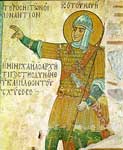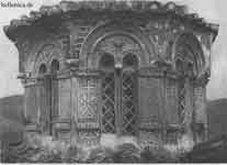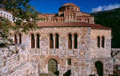 History The monastery of Osios Loukas is situated at a scenic site on the slopes of Mount Helicon. It was founded in the early 10th century by the hermit St. Lukas, whose relics are kept in the monastery to this day. The hermit (who died on 7 February 953) was famous for having predicted the conquest of Crete by Emperor Romanos. Although he likely referred to Romanos I, the island was actually reconquered by Nicephorus Phocas under Romanos II. It is believed that it was during the latter's reign (959-963) that the Church of the Theotokos (Panagia) was constructed. The main shrine of the monastery is the tomb of St. Lukas, originally situated in the vault, but later placed at the juncture of the two churches. The monastery derived its wealth (including funds required for construction) from the fact that the relics of St. Lukas were said to have exuded myron, a sort of perfumed oil which produced healing miracles. Pilgrims hoping for miraculous help were encouraged to sleep by the side of the tomb in order to be healed by incubation. The mosaics around the tomb represent not only St. Lukas himself, but also hegumen Philotheos offering a likeness of the newly-built church to the saint. Architecture The church of the Theotokos, the oldest in the complex, is the only church known to have been built in mainland Greece in the tenth century.[1] This centralized parallelogram-shaped building is the oldest example of the cross-in-square type in the country; its plan closely follows that of Fenari Isa Cami in Constantinople. The walls are opus mixtum (part brick, part stone, part marble) and display curious pseudo-kufic patterns. The Church of the Theotokos adjoins a larger cathedral church, or the Katholikon, tentatively dated to 1011-12. The Katholikon is the earliest extant domed-octagon church, with eight piers arranged around the perimeter of the naos. The hemispherical dome (without a drum) rests upon four squinches which make a transition from the octagonal base under the dome to the square defined by the walls below.[2] The main cube of the church is surrounded by galleries and chapels on all four sides. Decoration Osios Loukas is the largest of three monasteries surviving from the Middle Byzantine period in Greece. It differs from the Daphnion and Nea Moni in that it is dedicated to a single military saint. St. Lukas's prophecy about the reconquest of Crete is commemorated by the image of Joshua on the exterior wall of the Panagia church: Joshua was considered a model "warrior of the faith", whose help was especially effective in the wars waged against the Arabs. The Katholikon contains the best preserved complex of mosaics from the period of the Macedonian Renaissance. However, the complex is not complete: the original image of Christ Pantocrator inside the dome is missing, as are the figures of archangels normally placed between the upper windows. There is evidence that the monastery was reputed all over Byzantium for its lavish decoration, liberally applied to all surfaces. Apart from revetment, carving, gold and silver plate, murals, and mosaics (especially imposing on curving surfaces), the interior featured a choice assortment of icons, chandeliers, silk curtains, and altar cloths. Only a fraction of these items are still in situ, most notably colored marble facings and window grilles. Notwithstanding the losses, the Katholikon "gives the best impression available anywhere today of the character of a church interior in the first centuries after the end of Iconoclasm".[3] References