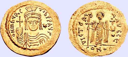 A solidus of Maurice's reign, Image http://www.cngcoins.com Flavius Mauricius Tiberius Augustus or Maurice (539 - November, 602) was the emperor of the Byzantine Empire from 582 to 602. A Cappadocian general was appointed as a successor by Tiberius II Constantine. He married Tiberus' daughter Constantina and when his father-in-law died a week later, become an Emperor. Maurice is the traditional author of the military treatise Strategikon which is praised in military circles as the first and only sophisticated combined arms theory until World War II. However, some historians now believe the Strategikon is the work of his brother or another general in his court. The reign of Maurice was troubled by almost unending wars on all frontiers, and despite his excellent ruling qualities he could only temporarily prevent the disintegration of the great empire of Justinian I. Shortly after his accession, in 590 he luckily interfered in a Persian war of succession, helping young Chosroes II to regain his throne. He also married a certain Maria, probably Maurice's daughter. In return, Armenia and eastern Mesopotamia returned to Byzantine Empire.