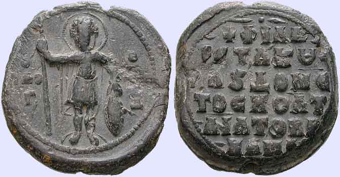 Seal of Philaretos Brachamios, Protokuropalates & Domestikos of the Schola of Anatolia (1080/1082). Vatican collection Philaretos Brachamios (Փիլարտոս Վարաժնունի, Pilartos Varajnuni in Armenian) was a distinguished Byzantine general and warlord of Armenian heritage. Philaretos is testified on seals as Taxiarches (Commander of an infantry regiment), as well as Protospatharios & Topoteretes (deputy commander) of the Tagmata of Cappadocia, then as Magister & Doux (Duke), then as Kuropalates & Doux. He held a high command in the army of Romanus IV Diogenes. After the battle of Manzikert (1071) - he commanded the forces of the fortress Romanopolis, he later escaped to the fortress of Germanicia. As the only remaining Byzantine general in the southeast he established a quasi autonomous realm, which stretched from Cilicia to Edessa. The core of his army was composed of 8000 Franks (Normans) under Raimbaud. In 1078, at the beginning of the rule of Nicephorus III Botaniates, he became Kuropalates & Doux of Antioch as well as Edessa. Several seals testify him as Megas Domestikos and Protokuropalates then Sebastos, then even still Protosebastos. In December 1084 he lost Antioch to Suleiman, the Sultan of Nicaea, in 1087 Edessa fell to Malik Shah and Philaretos escaped back to the fortress of Germanicia. However, some sources indicate that he died in 1086. He was the last well-known Scholen Domestikos of Anatolia. His sons handed Germanicia in 1098 to Crusaders.
