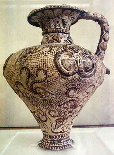 Minoan Can in Marine Style , Archaeological Museum of Herakleion Crete, Photo by Agon S. Buchholz Marine Style is the style of Ceramics of the Cretan-Minoan Neopalatial Period (c. 1650 BC to 1450 BC). A Characteristic of the Marine Style are motivs from the Sea World, painted with dark color on a bright background. Creto-Minoan Ceramic styles Agios Onouphrios Style | Barbotine Style | Floral Style | Kamares Style | Koumassa Style | Marine Style | Orientalizing Style | Palace Style | Pyrgos Style | Vassiliki Style | White Style Retrieved parts from "http://en.wikipedia.org/"
