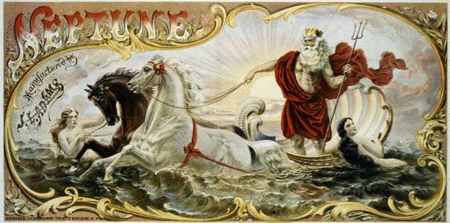 Tobacco label , 2 nymphs and 2 horses pulling Neptune through water