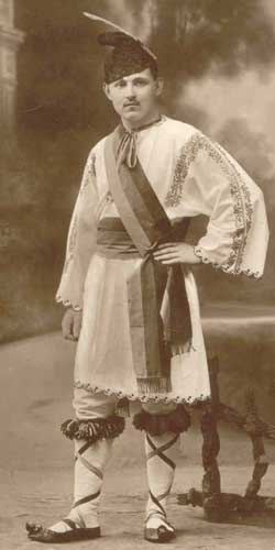 Romanian Calusari dancer from Arad, dressed in a traditional Romanian costume, early 20th century. Notice the fustanella type garment, simmilar with the costumes of the Morris dancers and the costumes of the Aromanians. Evolution The garment is made from long strips of linen sewn together to make a pleated skirt. Some Greeks, such as general Theodoros Kolokotronis had almost four hundred pleats in their garments, one for each year of Turkish rule over Greece. The style evolved over time. In the 18th and early 19th centuries, the skirts hung below the knees, and the hem of the garment was gathered together with garters and tucked into the boots to create a "bloused" effect. Later, during the Bavarian regency, the skirts were shortened to create a sort of billowy pantaloon that stopped above the knee; this garment was worn with hose, and either buskins or decorative clogs. This is the costume worn by the modern Greek evzones Presidential Guard. While the image of warriors with frilly skirts tucked into their boots may seem impractical to a contemporary audience, it should be noted that modern paratroopers use a similar method to blouse their trousers over their jumpboots. Lace was commonly worn on military uniforms in the west until well into the 19th century, and gold braid and other adornments still serve as markers of high rank in formal military uniforms. Fustanella were very labor-intensive and thus costly, which made them a status garment that advertised the wealth and importance of the wearer. Western observers of the Greek War of Independence noted the great pride which the klephts took in their foustanella, and how they competed to outdo each other in the sumptuousness of their costume.