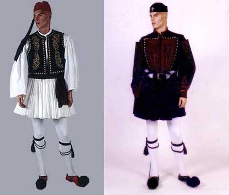 Greek Foustanelles - (right) - the Makedonomahi, which is from Macedonia, the northern most region of Greece. This costume is also known as the Pavlos Melas. Pavlos Melas was a general from Athens who fought for the freedom of Macedonia, against the Ottoman Empire. This costume is similar to the Tsolia, which is worn by the modern day soldiers, the Evzones(Εύζωνες). (left) - The Foustanella (Tsolias). It was established by Otto, the first King of Greece, as the formal court dress in the middle of the 19th century, prevailed in the urban centers of Moreas (Peloponnese) and Roumeli (Central Greece). This dress was originally the military outfit of the Greek chieftains. The waistcoat is called the “fermeli” and has panels hanging from the back. The men wear a white shirt with puffy sleeves under the fermeli that closes in front. The “foustanella” is the pleated skirt that is made of approximately 350 pleates called “langolia.” The Foustanela has changed in the meaning of detailed work, the length of the “fousta”, and, sometimes, the number of jackets worn. The sleeves have become decorative, resembling wings without the function of sleeves. After all the changes, it has become the standard Pan-Hellenic male costume worn today. Fustanella (for spelling in various languages, see chart below) is a kilt-like garment worn by men in the Balkans until the 19th century and is frequently identified with the elite Greek ceremonial unit of Presidential Guard, the Evzones. Etymology The ultimate derivation is from the Italian fustagno, referring to the fustian fabric of the early kilts. This in turn derives from Medieval Latin fūstāneum, perhaps a diminutive form of fustis, "wooden baton"; though the word may also derive from Fostat, a suburb of Cairo where cloth was manufactured.