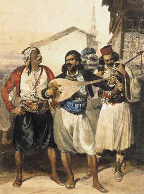 Greek Singers, "Chanteurs Grecs", Th. Leblanc , Coloured lithograph, 40 cm x 28 cm. (National Historical Museum, Athens, Print Collection no. 10281)