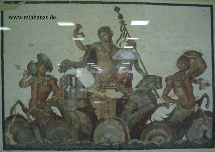 Dionysus Mosaic from the villa of Dionysus (Η έπαυλη του Διονύσου) . Dionysus the central figure is shown with a Papposilenus (an old Silenus). Two sea centaurs holding vases are shown. For the chariot two sea panthers are used. Part of a larger mosaic. Dionysus ist surrounded by mosaics of theatrical masks.