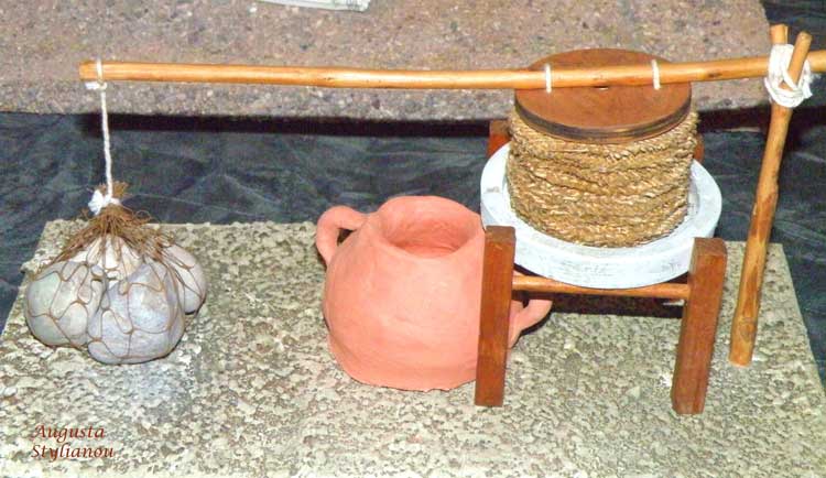 Olive Press. Photo : Augusta Stylianou Artist A representation of the oldest olive press of the "crowbar compression" type. Remain of this type of olive press were discovered on the island of Thirasia. It was described by Cato the Eldest while the unique depiction of it exists on a bas-relief of the 6th century BC, which is exhibited in the British Museum. The olive pulp, put in sacks was compressed by means of a lever and a counterbalance of stones. From "Ancient Greek Technology" exhibition at the Evagoras & Kathleen Lanitis Centre in Carob Mill Limassol Replicas and Reconstruction by Prof . Kostas Kotsanas and his students See also Agriculture of Ancient Greece More Images of Ancient Greek Technology