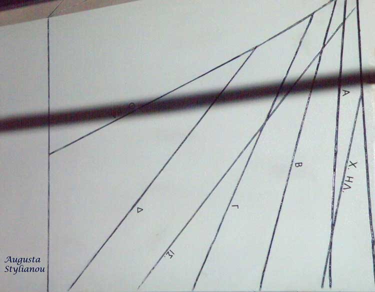 A vertical net orientated to the North-east with 5 engraved hour lines and three curves indicates with the help of the shadow trace from the horizontal (vertical to the net) gnomon tip, 4 unequal (depending on the season) daily hours after the sunrise (1st, 2nd, 3rd and 4th). The horizontal hour line at the height of the gnomon indicates the sunrise. The higher right curve indicates the course of the sun's shadow at the winter solstice, the left at the summer solstice and the middle straight line at the equinoxes.