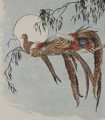 One moonlight evening as Master Fox was taking his usual stroll in the woods, he saw a number of Pheasants perched quite out of his reach on a limb of a tall old tree. The sly Fox soon found a bright patch of moonlight, where the Pheasants could see him clearly; there he raised himself up on his hind legs, and began a wild dance. First he whirled 'round and 'round like a top, then he hopped up and down, cutting all sorts of strange capers. The Pheasants stared giddily. They hardly dared blink for fear of losing him out of their sight a single instant. Now the Fox made as if to climb a tree, now he fell over and lay still, playing dead, and the next instant he was hopping on all fours, his back in the air, and his bushy tail shaking so that it seemed to throw out silver sparks in the moonlight. By this time the poor birds' heads were in a whirl. And when the Fox began his performance all over again, so dazed did they become, that they lost their hold on the limb, and fell down one by one to the Fox. Too much attention to danger may cause us to fall victims to it.