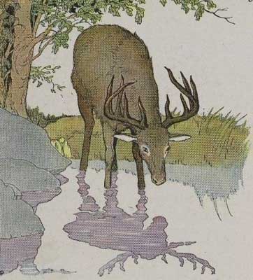 A Stag, drinking from a crystal spring, saw himself mirrored in the clear water. He greatly admired the graceful arch of his antlers, but he was very much ashamed of his spindling legs. At that moment he scented a panther and in an instant was bounding away through the forest. But as he ran his wide-spreading antlers caught in the branches of the trees, and soon the Panther overtook him. Then the Stag perceived that the legs of which he was so ashamed would have saved him had it not been for the useless ornaments on his head. We often make much of the ornamental and despise the useful