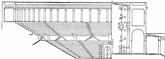 2. As a result of this plan with three centres, the Greeks have a roomier orchestra, and a "scaena" set further back, as well as a stage of less depth. They call this the λογεἱον, for the reason that there the tragic and comic actors perform on the stage, while other artists give their performances in the entire orchestra; hence, from this fact they are given in Greek the distinct names "Scenic" and "Thymelic." The height of this "logeum" ought to be not less than ten feet nor more than twelve. Let the ascending flights of steps between the wedges of seats, as far up as the first curved cross-aisle, be laid out on lines directly opposite to the angles of the squares. Above the cross-aisle, let other flights be laid out in the middle between the first; and at the top, as often as there is a new cross-aisle, the number of flights of steps is always increased to the same extent.[153]